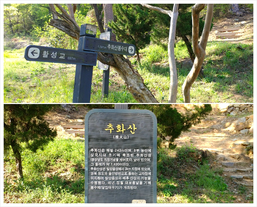 8부 능선에 사국시대 초기에 축조된 추화산성이 있고 봉수대가 있는데 둘러 보지는 못 했습니다.